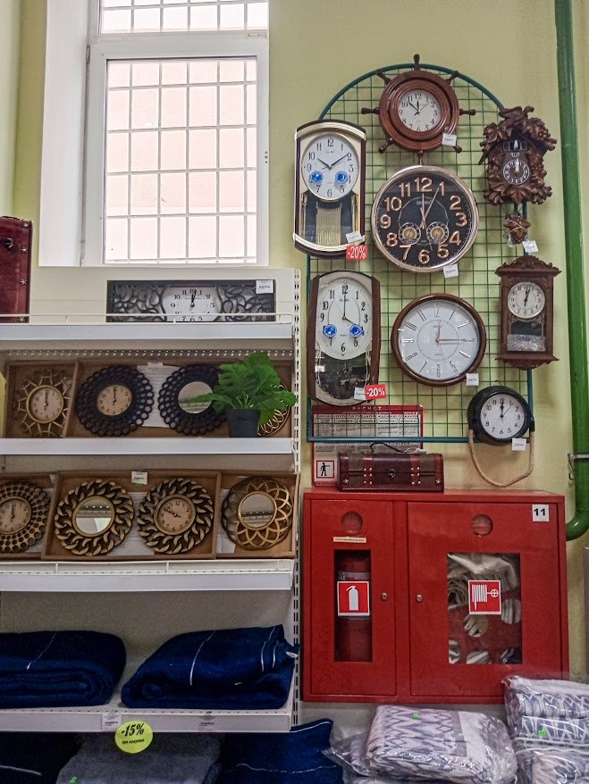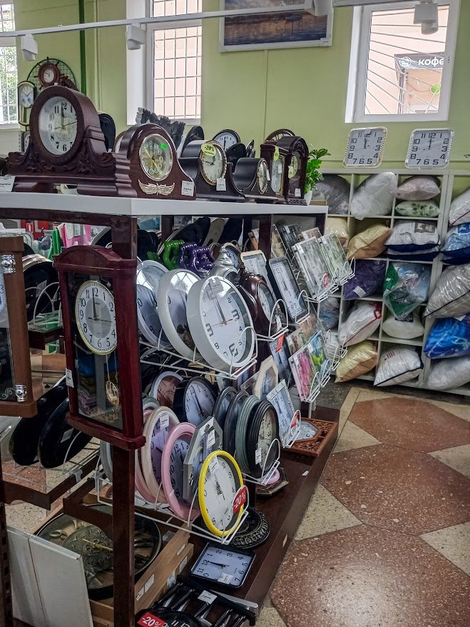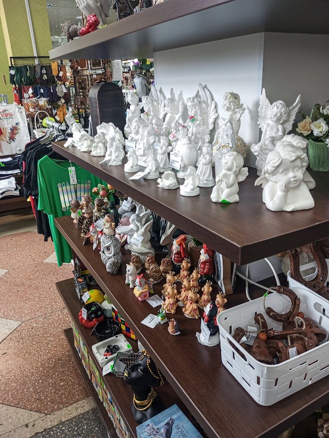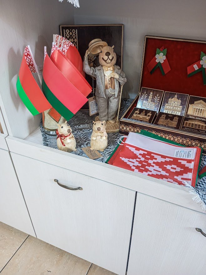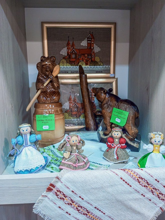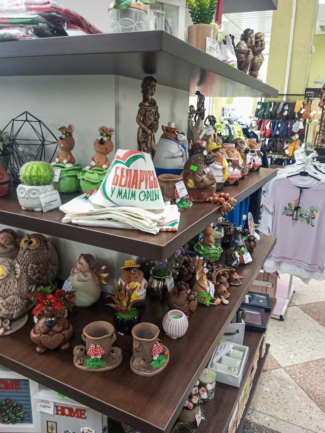 І на сёння асартымент мала змяніўся – ручнікі беларускай вытворчасці, шмат гадзіннікаў (але, падаецца, збольшага кітайскія), абрусы, трыкатаж, і, вядома – сувенірка. Не сказаць, што тут лепшы выбар у горадзе, ёсць бабры ў класічным вобразе Баброў Самуілавічаў, ручнікі (ці баваўняныя сурвэткі?) з патрыятычнымі надпісамі, гліняныя фігуркі жывёлак і птушак ды цэлая паліца анёлаў.