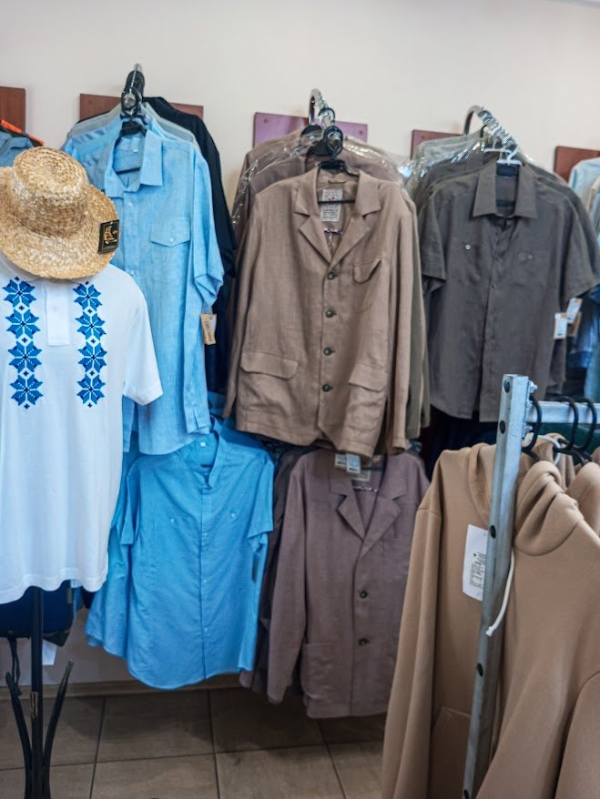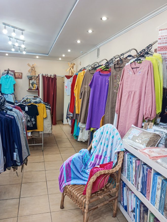 Асобны куток у краме – для ільнянога адзення. Тут ёсць рэчы як у народным стылі, з вышыўкай і традыцыйным кроем, так і сучасныя сукенкі ды кашулькі з спадніцамі, штанамі. А яшчэ – саламяныя капелюшы, брылі.