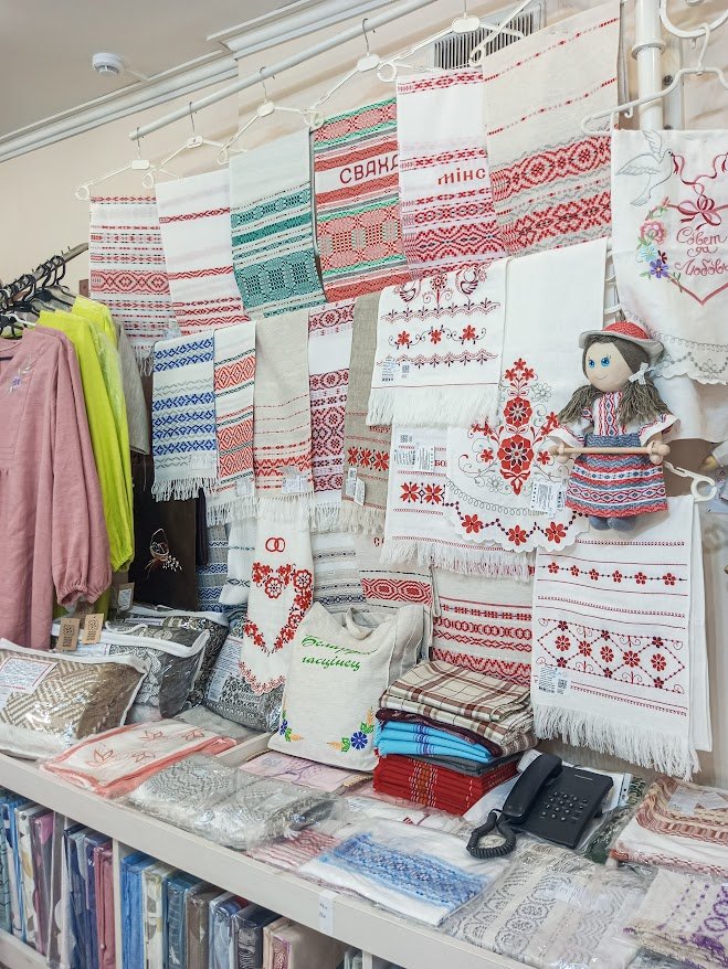 Таксама ва ўнівермагу можна набыць у якасці сувеніра адзенне беларускай вытворчасці, напрыклад, ад брэнда «belarusachka», які шые рэчы для сну і адпачынку, ці ад «Мілавіцы» з «Світанкам».